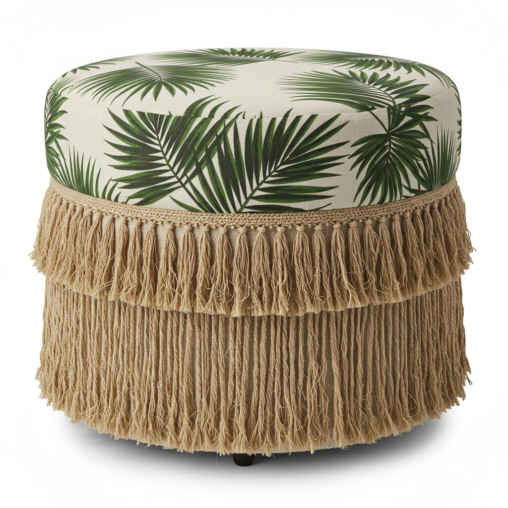 Custom upholstered pouf in citrine alpaca fabric with French Bouillon trim.