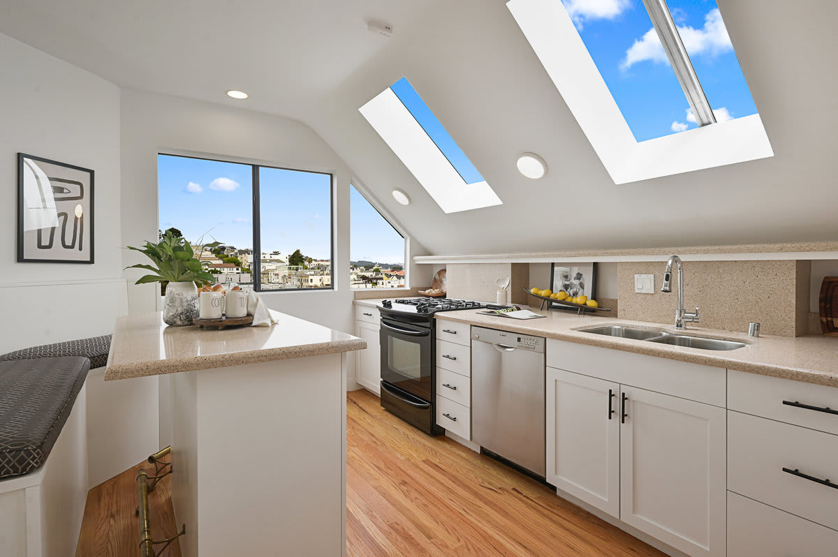 At the end of the main floor lies a light-filled modernized kitchen with skylights, stainless steel appliances, and a built-in dining area that enjoys stunning views of the bay. Wake up to views of the Golden Gate Bridge every morning from the quiet west-facing primary bedroom. Completing the main floor is a secondary bedroom, a remodeled primary bath with a soaking tub, and a secondary full bath with a stalled shower and stackable washer and dryer.