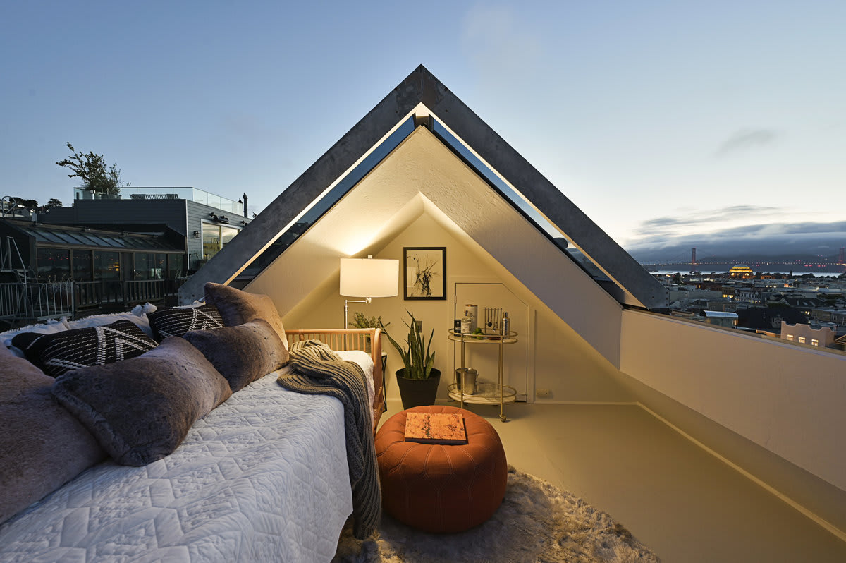 - Signature lofted solarium room with mechanical retractable glass roof and pano bay, city and GG Bridge Views. Ideal for stargazing under the open sky!