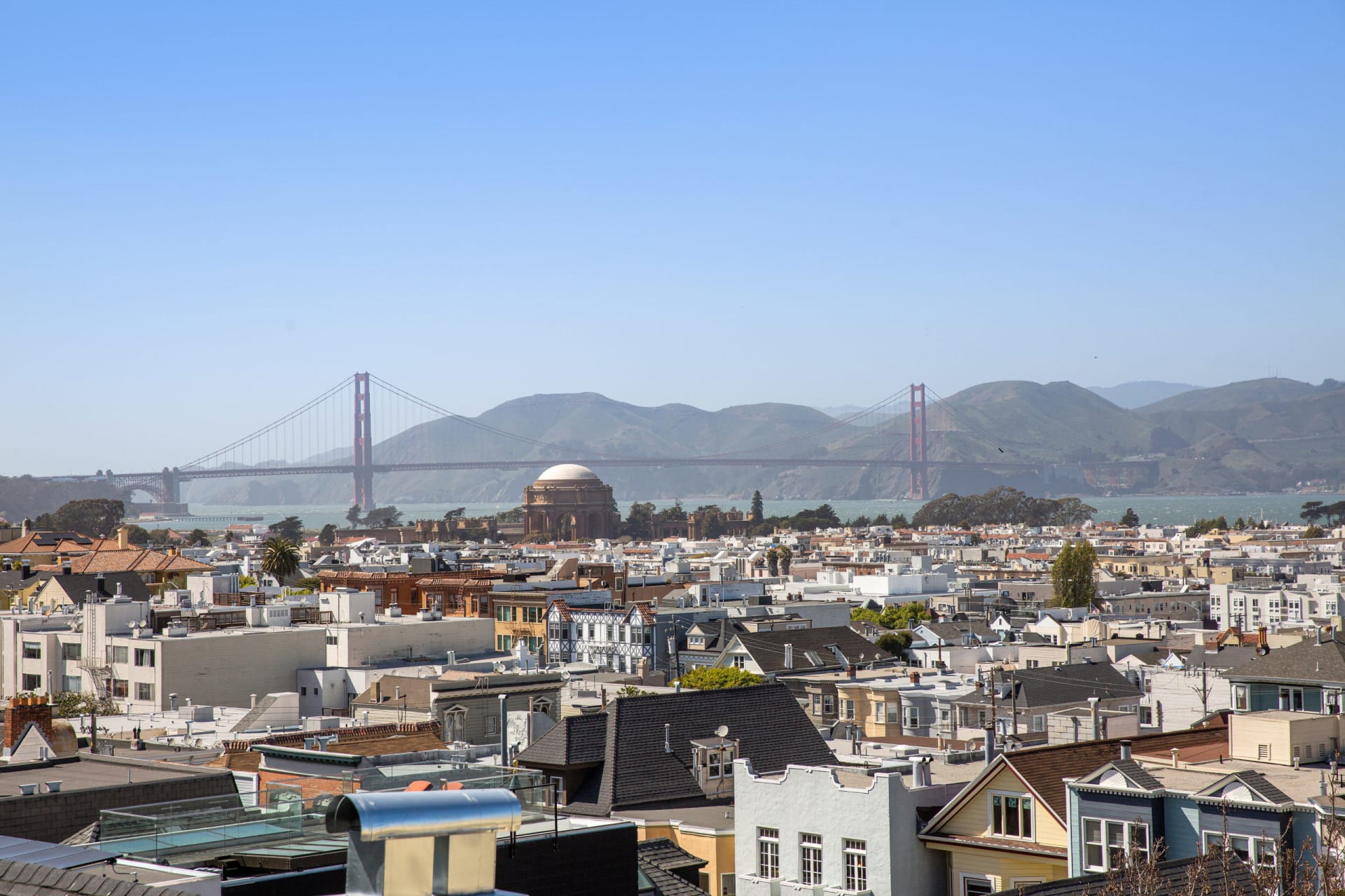 Spacious 2-level penthouse view condo in a lavish 1900 Beaux-Art building at the intersection of Cow Hollow and Pacific Heights. This stunning contemporary residence features big views of the Golden Gate Bridge, the Palace of Fine Arts, Alcatraz and the shimmering Bay. You will be in awe of the second level’s solarium style room that features a powered peaked retractable roof with stunning views and the full open sky for stargazing above. It’s like having your own private rooftop with postcard quality views!